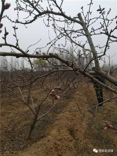 這張是施用其他牌子有機(jī)肥的,明顯可以看出花苞小,幾乎沒有抽芽,生長期要比施用農(nóng)沃綠生物有機(jī)肥的桃樹落后6-8天左右。