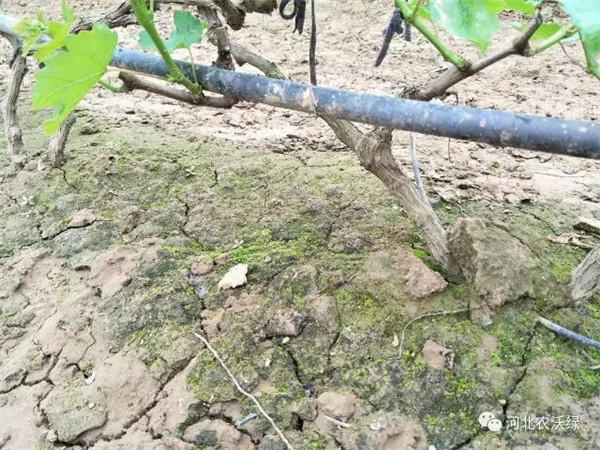 去年秋天葡萄小鎮(zhèn)的部分種植戶來到農(nóng)大實驗站,聽取農(nóng)業(yè)專家講解葡萄管理技術,講解了他們這種傳統(tǒng)種植方法的弊端,不腐熟的農(nóng)家肥和劣質(zhì)有機肥不僅會對做物造成燒苗,還會帶入大量病菌造成作物土傳病害嚴重,使土壤板結和鹽漬化,作物不能正常生長,最終導致減產(chǎn)。如下圖,地表長綠苔,PH值在8.5,偏堿,超出葡萄正常生長范圍