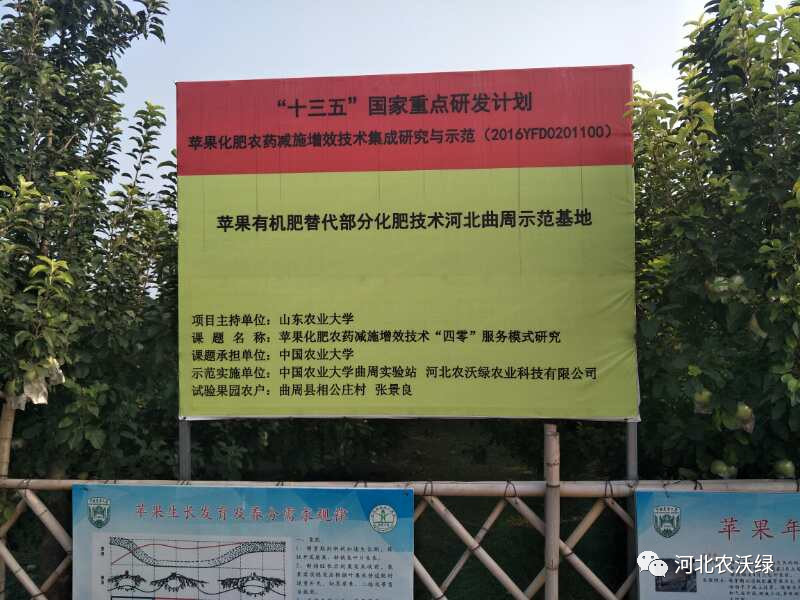 快到果園的時(shí)候,遠(yuǎn)遠(yuǎn)看見(jiàn)一個(gè)豎立起來(lái)大的牌子,牌子上寫(xiě)了一行大字“十三五”國(guó)家重點(diǎn)研發(fā)計(jì)劃?磥(lái),村民所言非虛!這更激起了筆者的好奇心,又往前走進(jìn)了一些,“蘋(píng)果有機(jī)肥替代部分化肥技術(shù)河北曲周示范基地”的字樣也就映入了眼簾。似乎看出來(lái)筆者心理的疑惑,張大哥這才笑呵呵的講起這片果園故事的由來(lái)。