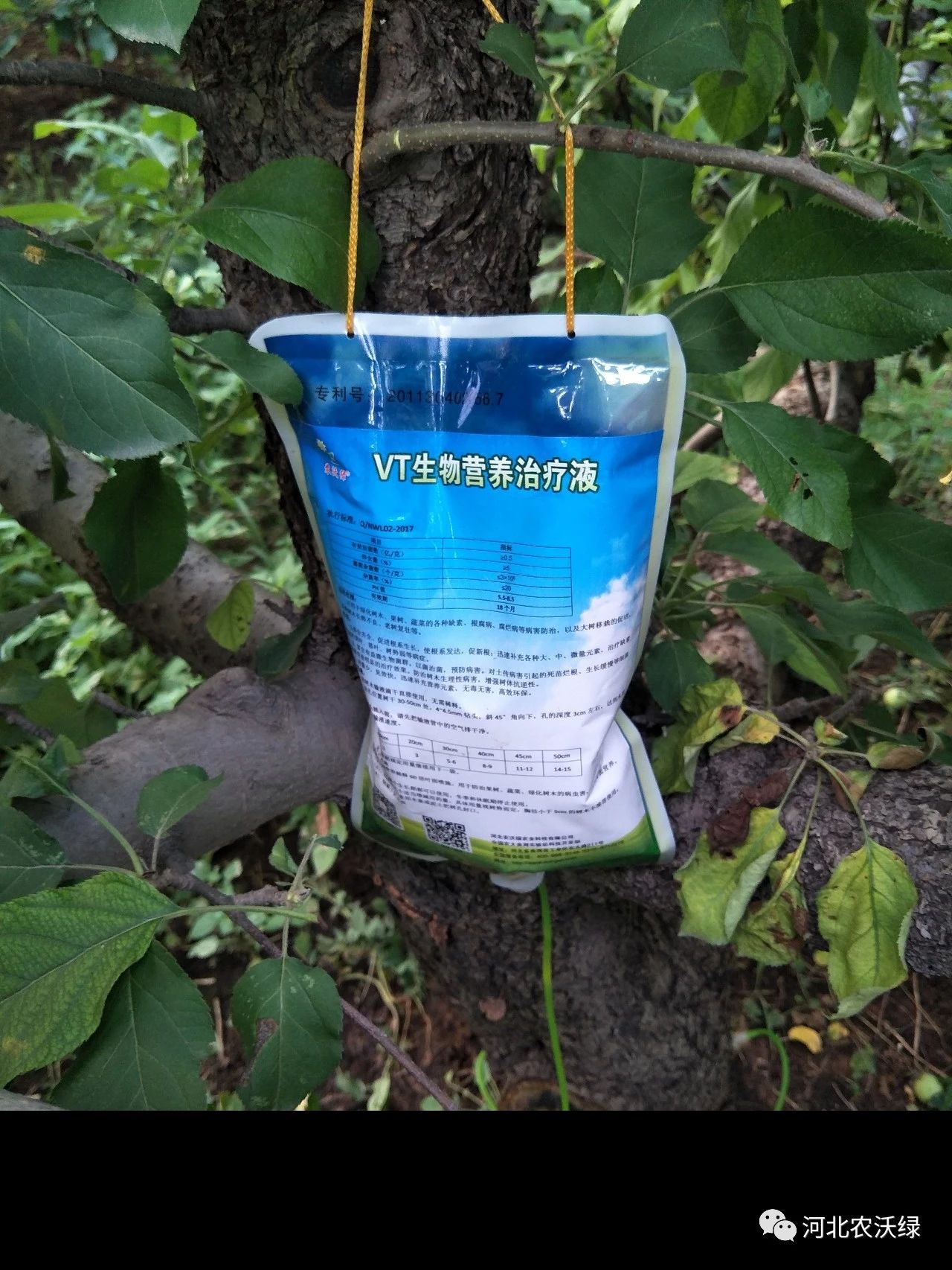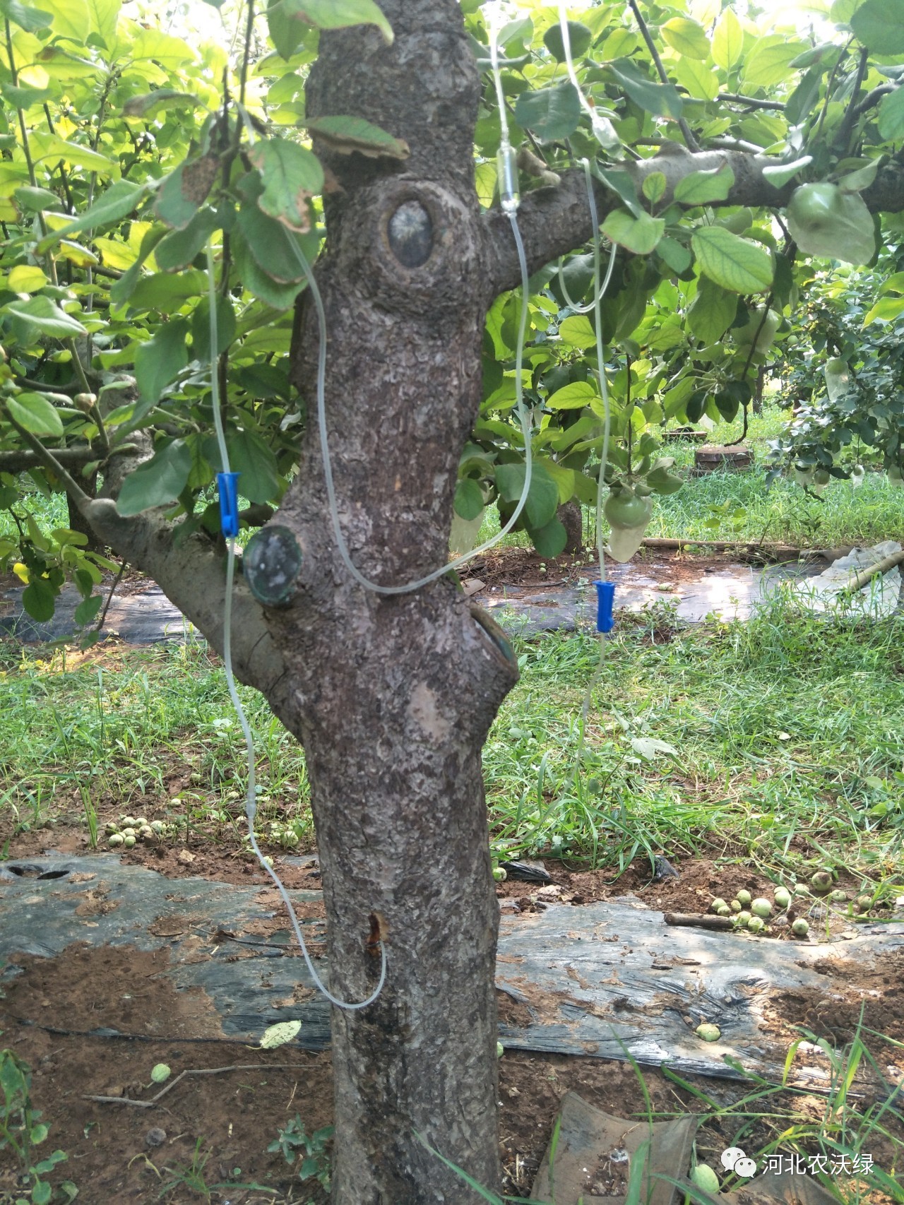 按照工作人員的指導(dǎo)施肥和管理后張大哥覺(jué)得果園今年長(zhǎng)勢(shì)比往年要好,掛果量也明顯增多了?吹叫Ч髲埓蟾缬致(lián)系了工作人員,希望對(duì)方能幫助他解決蘋(píng)果葉片黃化問(wèn)題,很快就有工作人員來(lái)果園了解情況,并向他推薦了使用農(nóng)沃綠VT營(yíng)養(yǎng)治療液給果樹(shù)輸液的方案,可以對(duì)果樹(shù)黃化采取輸液滴干治療的方式解決果樹(shù)病癥。