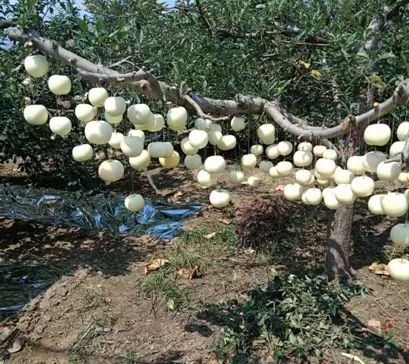 我們在摘袋過程中,難免有碰掉蘋果現(xiàn)象,對于掉落的蘋果,若無跌傷碰傷,可集中收集,用線系住果柄,一條線兩頭各纏一個掉落蘋果果柄,懸掛于可充分接受光照的樹干上。若果柄也掉落,可用塑料袋盛裝懸掛,只要光照充足,亦可良好上色,不影響果實商品性。