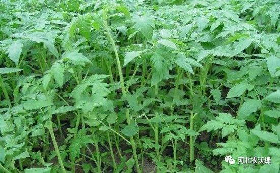 氮肥施用過多,田間濕度大,光照不足,番茄苗定植過密、通風(fēng)透氣不良,營養(yǎng)生長與生殖生長不協(xié)調(diào),造成瘋秧徒長。