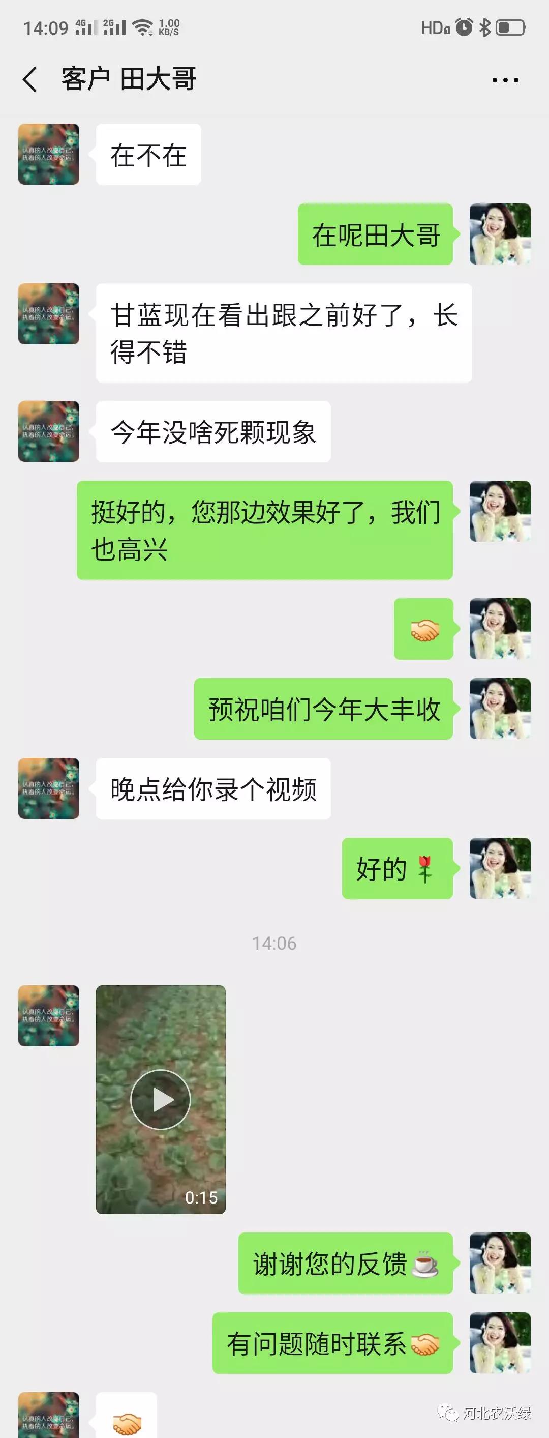 隨后我們?nèi)グ菰L了田大哥,再次見到田大哥可以用喜出望外來形容,跟之前的愁眉不展簡直就是兩個(gè)極端,田大哥說:“沒想到你們農(nóng)沃綠產(chǎn)品效果這么好”,這一句話是田大哥對我們公司產(chǎn)品的認(rèn)可及肯定,身為農(nóng)沃綠公司的一員,我感到很高興,也很自豪。