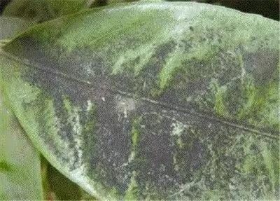煤污病主要危害植物的葉片,也危害嫩枝、花器等部位。發(fā)病初期在葉面、枝梢表面上形成圓形黑色小霉斑,有的沿主脈擴(kuò)展,后擴(kuò)大連片,使整個(gè)葉面、嫩梢上布滿黑霉層,形成較厚的黑色或黑褐色的煤煙狀層,嚴(yán)重時(shí)形成黑色霉層,有時(shí)在干燥條件下霉層開裂剝落。