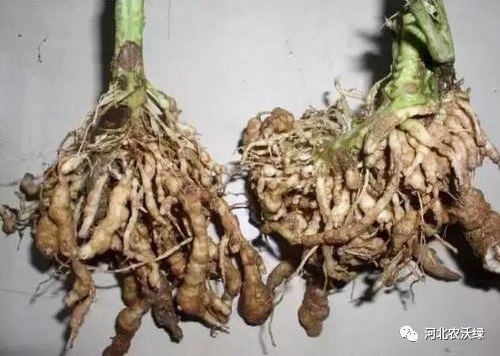 為了找出背后的真相,把西瓜的根系挖了出來,可見側根和須根有許多的瘤狀根結,這些瘤狀根結有的呈串珠狀,有的似雞爪狀,有的呈白色,有的已經(jīng)變成了黑色,并伴隨著腐爛的跡象。將西瓜的情況咨詢相關的專家后得知,原來西瓜的根部是受到了根線蟲的侵染。
