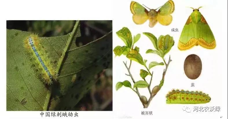 綠刺蛾:又叫洋辣子。卵扁橢圓形,淡黃綠色,老熟幼蟲略呈長(zhǎng)方形,初黃色,后稍大為黃綠至綠色。