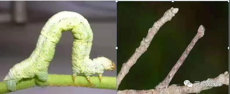 尺蠖(huo):靜止時(shí),常用腹足和尾足抓住茶枝,使蟲體向前斜伸,頗像一個(gè)枯枝,受驚時(shí)即吐絲下垂。