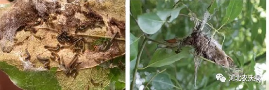 樟巢螟:1-2齡幼蟲取食葉片,3- 5齡幼蟲吐絲綴合小枝與葉片,形成鳥巢樣的蟲巢。